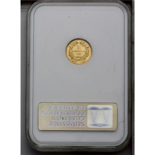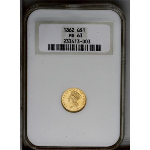 <B>1862<G$1> MS63 NGC.</B></I> A richly lustrous example with a pleasing effulgent sheen on both sides. A few wispy hairlines and a couple of faint pinscratches are noted in the obverse fields. An intricately struck and carefully preserved canary-gold Type Three dollar. <BR><BR><B>Important notice:</B> Heritage usually auctions material at the rate of 200-250 lots per hour. On some occasions eBay Live bid software or the Internet may not be able to keep up with the pace of the auction. We recommend placing a realistic absentee bid now as insurance to avoid disappointment. Occasionally the auctioneer may eliminate or reject an eBay Live bid, and the auctioneer may also reopen a lot after the close of the eBay live bidding (usually because we missed an audience bid), and may reject your bid even if it shows you as the winning bidder. By bidding via eBay Live, you agree that Heritage may award the lot to another bidder at its sole discretion under the circumstances described above or any other reasonable circumstances. Since eBay bids are not shown to us until we open the lot on the floor, we treat those bids just like floor bids. In most cases the floor responds before the eBay bid is presented to us, due to Internet lag time, so for consistency we have made it a policy that floor bids are always considered first over tie eBay live bids. Also please note that all Heritage lots purchased through eBay Live carry a 20% Buyer's Premium. Please make sure you read the Terms and Conditions before you bid. This lot is being auctioned in conjunction with a live floor auction by Heritage Galleries & Auctioneers. All final auction and invoice information will be supplied by Heritage Galleries & Auctioneers, and all other information should be considered preliminary. Lot:2302 <BR><BR><B>Winning Notification and Billing:</B> After the FINAL session in this auction is complete, Heritage will send e-mail and snail mail invoices. This process normally takes several days. All final auction and invoice information will be supplied by Heritage Galleries & Auctioneers, and all other information should be considered preliminary. <BR><BR>This auction will be conducted on a live auction floor and over the Internet through eBay Live. If you choose to place an absentee bid, please take a moment to <font color='#0000ff'><u><a href='http://pages.ebay.com/liveauctions/help/before/laabsentee.html'>learn how eBay Live absentee bidding works</a></u></font><font color='#000000'>