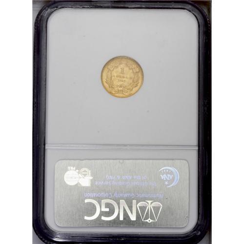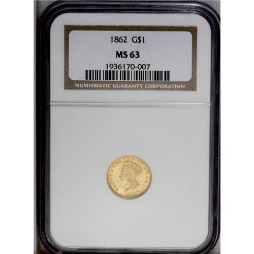 <B>1862<G$1> MS63 NGC.</B></I> From the Civil War years comes this yellow-orange beauty. Nicely struck with generally satiny luster and a shimmering patch near 7 o'clock, likely from die polishing.<BR><I>From The Derrick Snider Collection.</B></I>