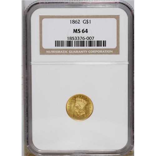 <B>1862 G$1 MS64 NGC.</B></I> This highly lustrous amber-gold representative has excellent detail. A handful of light abrasions on the reverse bar the way to a Gem grade.<BR><BR><b>Shipping:</b> Coin/Currency (<a target="_blank" href="http://www.heritageauctions.com/common/shipping.php">view shipping information</a>)