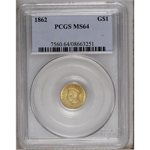 1862 G$1 MS64 PCGS. A lustrous, smooth, and creamy exa