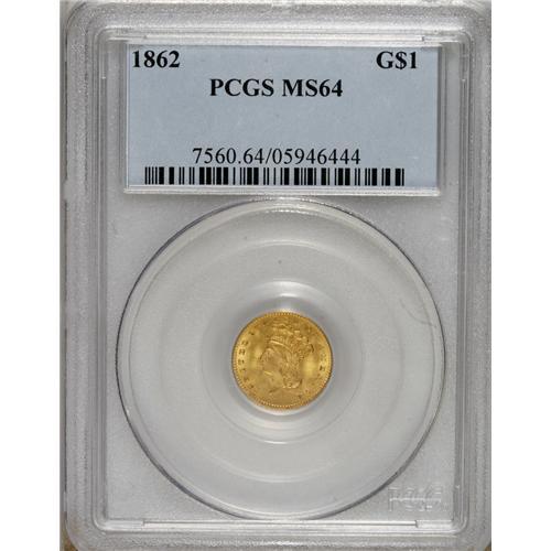<B>1862 G$1 MS64 PCGS.</B></I> A pleasing mix of peach-gold and mint-green coloration rests upon intensely lustrous surfaces, and a penetrating strike brings out great definition on the design elements. Some minor handling marks define the grade. A popular type coin.<BR><BR><b>Shipping:</b> Coins & Currency (<a target="_blank" href="http://www.heritageauctions.com/common/shipping.php">view shipping information</a>)