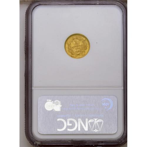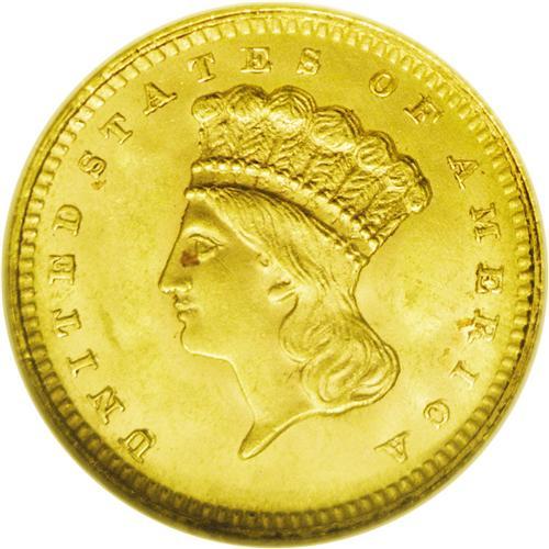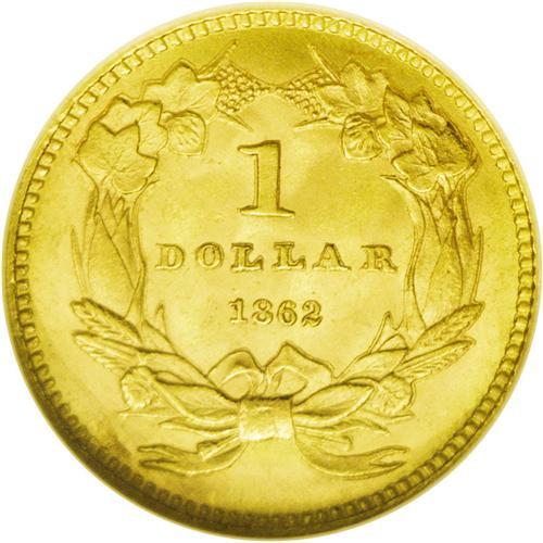 <B>1862<G$1> MS65 NGC.</B></I> FS-001, Breen-6074. Doubled Die Obverse. This is a fascinating doubled die variety, one of the clearest in the series of U.S. gold coinage. The shifted details that are visible exhibit approximately 25% separation. In addition to the die doubling, this example <I>also</B></I> exhibits machine doubling on the obverse. This phenomenon is especially evident at Liberty's mouth, with an extra set of lips from the machine doubling slightly to the left, and an additional set of lips visible from the die doubling slightly above and to the right. This is a frosty Gem with brilliant yellow-gold luster and pristine surfaces. NGC has only certified seven examples of this variety. Doubled Die Census: 1 in 65, 0 finer (7/06).
