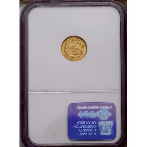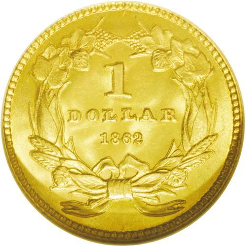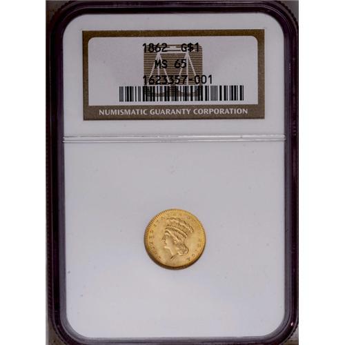 <B>1862<G$1> MS65 NGC.</B></I> Mint personnel had a devil of a time striking up the Type Two one dollar gold pieces properly, resulting in the redesigned Type Three pieces after a short regime for the flawed design. Such a Type Three coin as this splendid Gem assures us that the Mint finally got it right. The strike is bold, with no trace of weakness on the date (the most common plague on Type Two coins), nor on the headdress feathers or the highpoint hair. The reverse wreath is equally crisp. The surfaces are a pretty orange-gold, with abundant luster and no distractions worthy of mention--including an absence of clash marks. Census: 94 in 65, 56 finer (5/06).