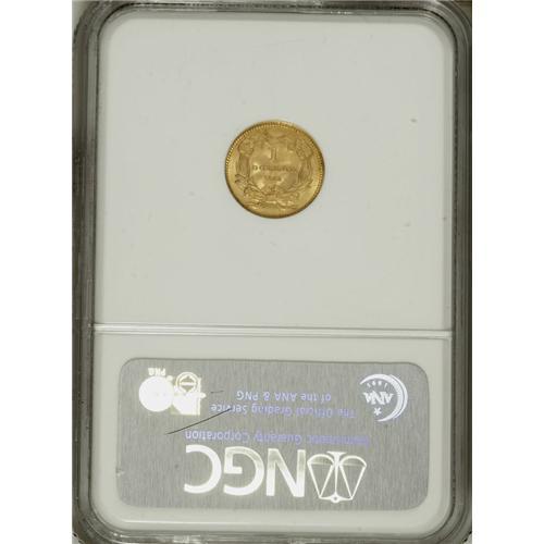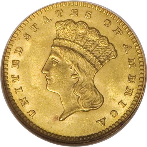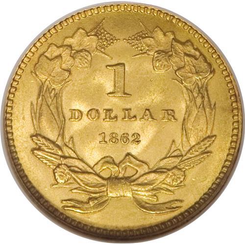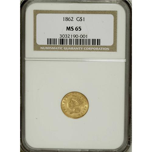 <B>1862 G$1 MS65 NGC.</B></I> The date logo for this year is curiously small, although on this example it is well struck and bold. The large mintage exceeding 1.3 million pieces makes this one of the most available Type Three dollars in high grade. The yellow-orange surfaces boast brilliant luster and premium appeal, and there are no singular distractions.<BR><BR><b>Shipping:</b> Coins & Currency (<a target="_blank" href="http://www.heritageauctions.com/common/shipping.php">view shipping information</a>)