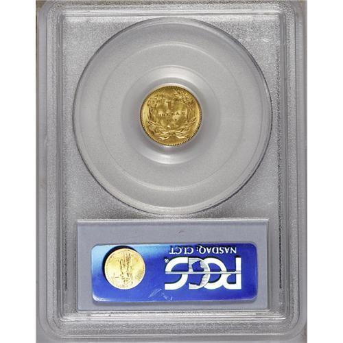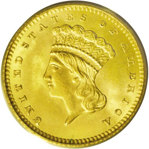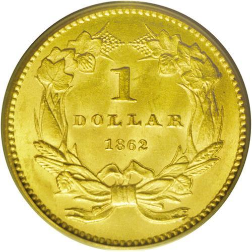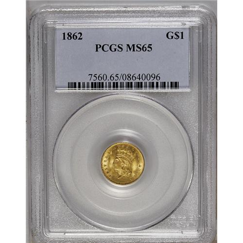 <B>1862<G$1> MS65 PCGS.</B></I> An attractive Gem example of this plentiful date with frosty yellow-gold surfaces and brilliant luster. Both sides feature full design details and pristine, unblemished surfaces. Population: 63 in 65, 29 finer (7/06).
