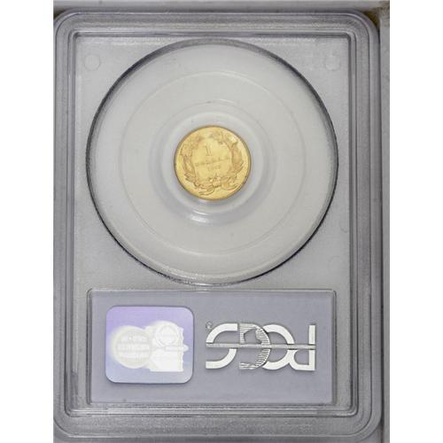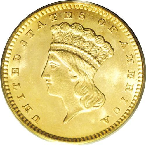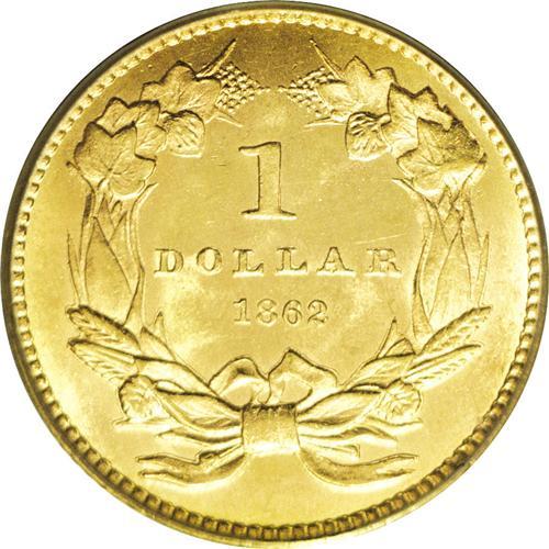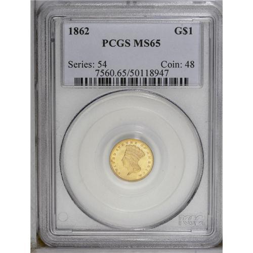 <B>1862<G$1> MS65 PCGS.</B></I> This issue boasts an enormous mintage for the series in excess of 1.3 million pieces, but Gems are nonetheless scarcer than might be imagined. This Type Three gold dollar, surprisingly, shows no clash marks, and it is boldly struck, with beautiful honey-gold surfaces and no apparent distractions. Population: 57 in 65, 26 finer (3/06). <BR><BR><B>Important notice:</B> Heritage usually auctions material at the rate of 200-250 lots per hour. On some occasions eBay Live bid software or the Internet may not be able to keep up with the pace of the auction. We recommend placing a realistic absentee bid now as insurance to avoid disappointment. Occasionally the auctioneer may eliminate or reject an eBay Live bid, and the auctioneer may also reopen a lot after the close of the eBay live bidding (usually because we missed an audience bid), and may reject your bid even if it shows you as the winning bidder. By bidding via eBay Live, you agree that Heritage may award the lot to another bidder at its sole discretion under the circumstances described above or any other reasonable circumstances. Since eBay bids are not shown to us until we open the lot on the floor, we treat those bids just like floor bids. In most cases the floor responds before the eBay bid is presented to us, due to Internet lag time, so for consistency we have made it a policy that floor bids are always considered first over tie eBay live bids. Also please note that all Heritage lots purchased through eBay Live carry a 20% Buyer's Premium. Please make sure you read the Terms and Conditions before you bid. This lot is being auctioned in conjunction with a live floor auction by Heritage Galleries & Auctioneers. All final auction and invoice information will be supplied by Heritage Galleries & Auctioneers, and all other information should be considered preliminary. Lot:2303 <BR><BR><B>Winning Notification and Billing:</B> After the FINAL session in this auction is complete, Heritage will send e-mail and snail mail invoices. This process normally takes several days. All final auction and invoice information will be supplied by Heritage Galleries & Auctioneers, and all other information should be considered preliminary. <BR><BR>This auction will be conducted on a live auction floor and over the Internet through eBay Live. If you choose to place an absentee bid, please take a moment to <font color='#0000ff'><u><a href='http://pages.ebay.com/liveauctions/help/before/laabsentee.html'>learn how eBay Live absentee bidding works</a></u></font><font color='#000000'>