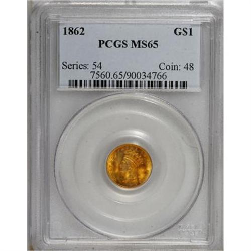 <B>1862 G$1 MS65 PCGS.</B></I> The R in AMERICA is not fully brought up; otherwise the strike is razor-sharp, both on the highpoints of the portrait and on the denomination. A lustrous Gem with vivid lilac-red, sunset-orange, and mint-green coloration, and exquisitely preserved surfaces. Population: 70 in 65, 27 finer (8/07). <BR><BR><B>Coin Engraver:</B> James B. Longacre<BR><BR><b>Shipping:</b> Coins & Currency (<a target="_blank" href="http://www.heritageauctions.com/common/shipping.php">view shipping information</a>)