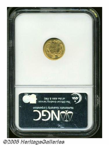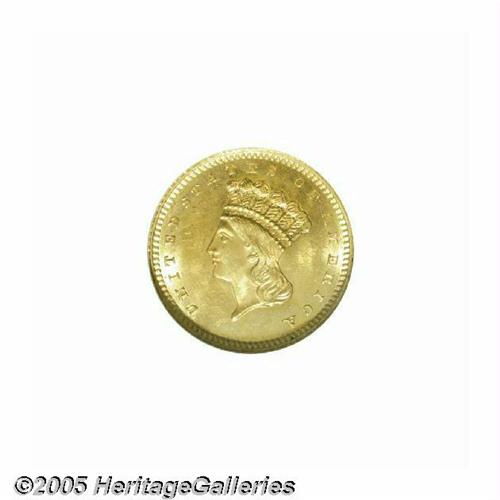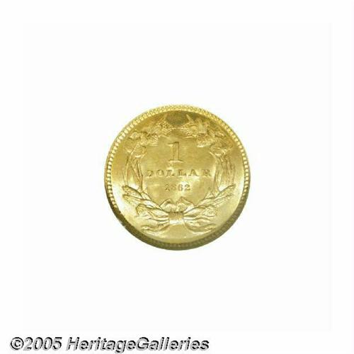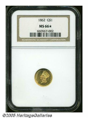 <B>1862<G$1> MS66 <S NGC.</B></I> More Gold Dollars were struck in 1862 (1.36 million pieces) than were struck for all dates combined between 1863 and the demise of the type in 1889. However, premium Gems are scarce, especially with the charm of the present piece, which has received a star designation (for superior eye appeal) from NGC. The honey-gold fields are smooth and display a hint of reflectivity. The obverse is especially well preserved. The needle-sharp strike has created a wire rim across the obverse diameter.