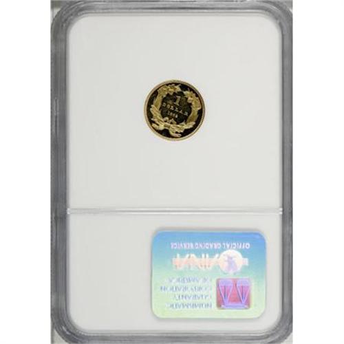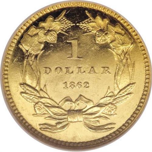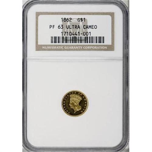<B>1862 G$1 PR63 Ultra Cameo NGC.</B></I> The obverse of the Type Three gold dollar shows only Liberty's head and UNITED STATES OF AMERICA, with no indication of a year. The Philadelphia Mint, in what may have been a move to economy, used a single, heavily polished obverse die to strike more than a decade's worth of proofs; this die is best identified by weakness at the foremost feathers of the headdress.<BR> This lemon-gold Select specimen boasts obvious contrast. The strike is crisp, and despite scattered hairlines and contact in the fields, the overall eye appeal is surprisingly strong. With an uncommonly bold cameo effect on each side, this is a desirable survivor from an issue of only 35 pieces. Census: 1 in 63 Ultra Cameo, 5 finer (2/08).<BR><BR><b>Shipping:</b> Coins & Currency (<a target="_blank" href="http://www.heritageauctions.com/common/shipping.php">view shipping information</a>)