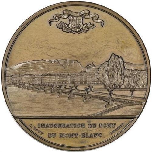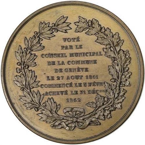 <B>1862 Geneve Commune Municipal Council Inauguration.</B></I> Bronze, 50.5 mm. Plain edge without privy mark. Dies by A. Body and Direxit. Obverse: view of bridge across river leading to building complex, hillside in background, Protestant motto Post Tenebras Lux above. Reverse: nine-line French language inscription within wreath.<BR><BR><b>Shipping:</b> Coins & Currency (<a target="_blank" href="http://www.heritageauctions.com/common/shipping.php">view shipping information</a>)