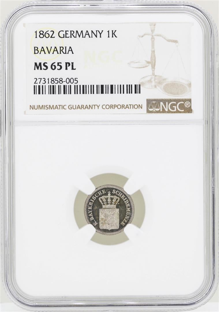 One 1862 Germany Kreuzer Bavaria Proof Coin NGC MS65PL. NGC Certified.