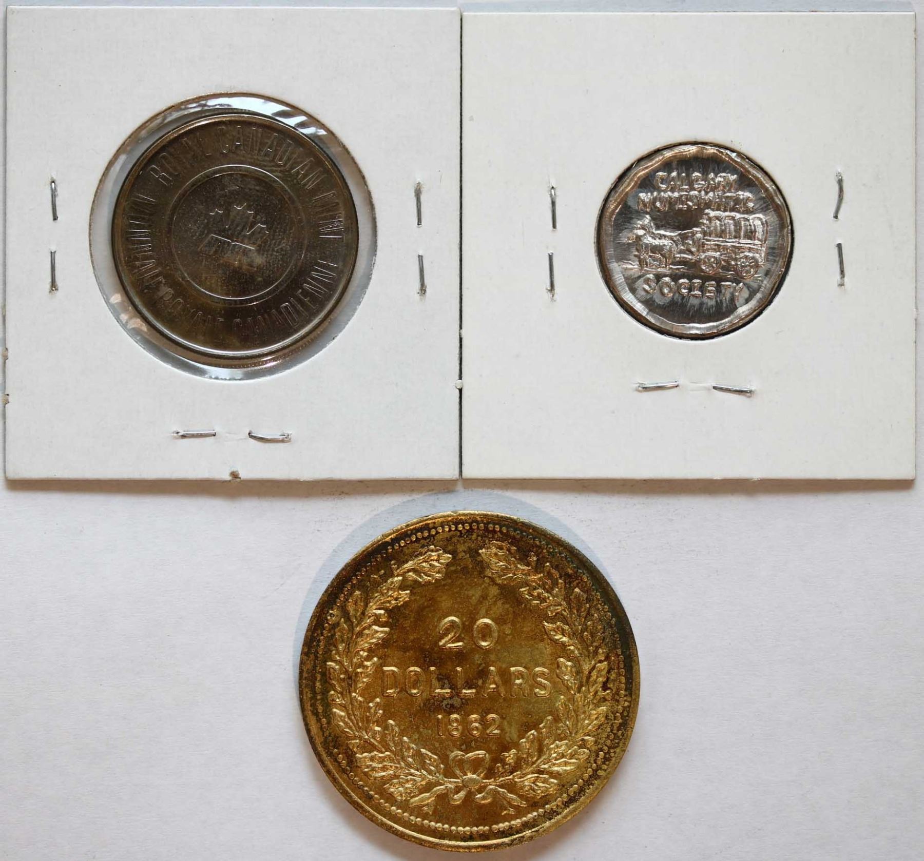 1862 Gilt $20 Gold Rush Coin - Government of British Columbia Counterfeit/Reproduction issue, 2005 RCM Token & CNA 2005 Token.