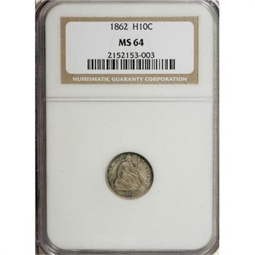 <B>1862 H10C MS64 NGC.</B></I> . NGC Census: (142/143). PCGS Population (107/120). Mintage: 1,492,550. Numismedia Wsl. Price for NGC/PCGS coin in MS64: $380. (#4381)<BR><BR><B>Coin Engraver:</B> Christian Gobrecht<BR><BR><b>Shipping:</b> Coins & Currency (<a target="_blank" href="http://www.heritageauctions.com/common/shipping.php">view shipping information</a>)