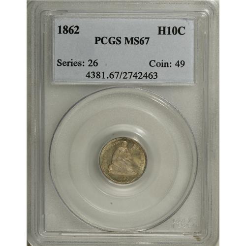 <B>1862 H10C MS67 PCGS.</B></I> Dazzling luster overwhelms the medium apricot and lilac patina. An intricately struck and nearly immaculate Superb Gem. The 1862 was the final Civil War half dime issue to exceed a mintage of 120,000 pieces. Once specie payments were suspended, fractional currency replaced silver coinage in circulation. Population: 17 in 67, 3 finer (11/06).<BR><BR><b>Shipping:</b> Coin/Currency (<a target="_blank" href="http://www.heritageauctions.com/common/shipping.php">view shipping information</a>)