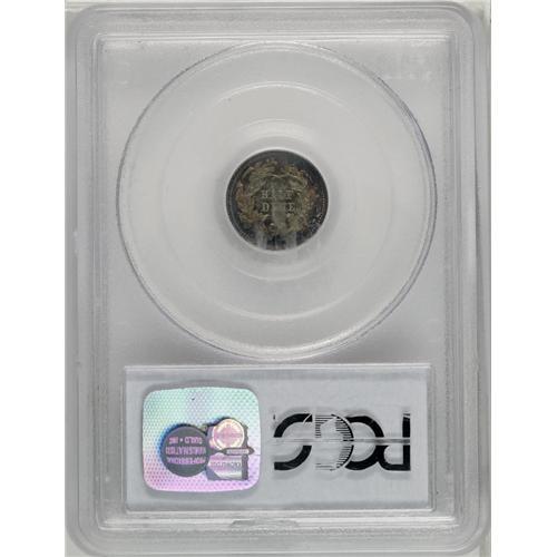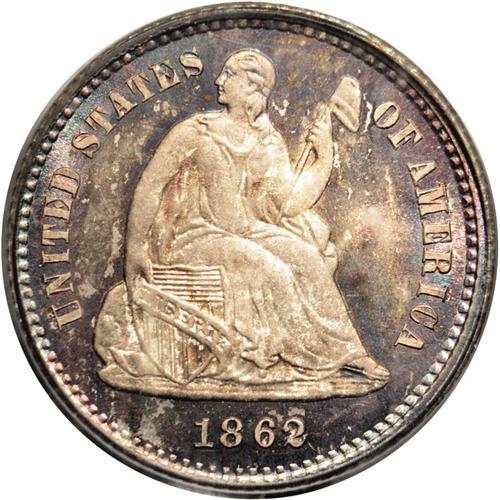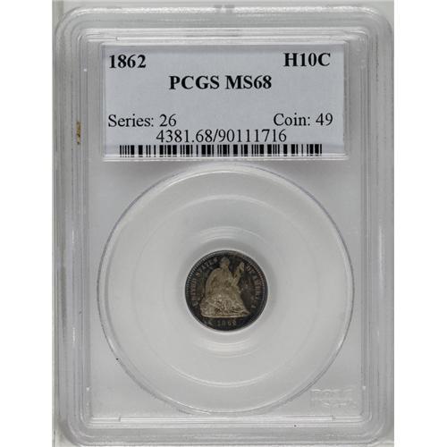 <B>1862<H10C> MS68 PCGS.</B></I> This is tied with two others as the finest example of the date to be certified by PCGS, although we suspect that there is probably a resubmission factor involved as well. The present example is a remarkable coin with intense lilac, blue, and gold color, deeper in the fields. Both sides have satiny, almost prooflike luster, with excellent cameo-like contrast. The fields on both sides have fine diagonal die lapping or polishing lines, the most prominent starting in the field near Liberty's wrist, and extending up to the left through the first S in STATES. We mention this as the initial examination suggests that this is a scratch, but close inspection reveals that it is a die line transferred to the planchet when this coin was struck.