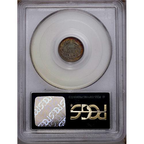 <B>1862<H10C> PR63 PCGS.</B></I> A razor-sharp specimen with luminous forest-green, cherry-red, and gold toning. Most of the obverse is brilliant, however. Clean for the grade, and housed in a green label holder. A scant 550 proofs were struck.