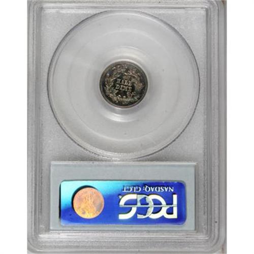 <B>1862 H10C PR64 PCGS.</B></I> A dainty near-Gem example of this popular Civil War-era proof half dime issue, sharply struck with dappled turquoise and ocean-blue patina over the silver-white surfaces. A handful of hairlines are barely perceptible beneath the toning. Population: 39 in 64, 40 finer (8/07).<BR><BR><B>Coin Engraver:</B> Christian Gobrecht<BR><BR><b>Shipping:</b> Coins & Currency (<a target="_blank" href="http://www.heritageauctions.com/common/shipping.php">view shipping information</a>)