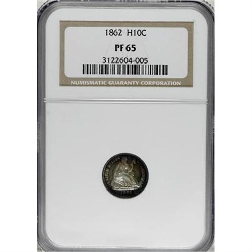 <B>1862 H10C PR65 NGC.</B></I> This is an immensely appealing Gem specimen with amazingly deep, lovely original toning near the obverse and reverse peripheries. Sharply struck and well preserved, with highly reflective fields and a few wispy hairlines that prevent an even finer grade. A desirable, low-mintage Civil War issue of just 550 pieces. Census: 20 in 65, 23 finer (12/07).<BR><I>From The John Stimson, Sr. Collection, Part Two.</B></I><BR><BR><B>Coin Engraver:</B> Christian Gobrecht<BR><BR><b>Shipping:</b> Coins & Currency (<a target="_blank" href="http://www.heritageauctions.com/common/shipping.php">view shipping information</a>)