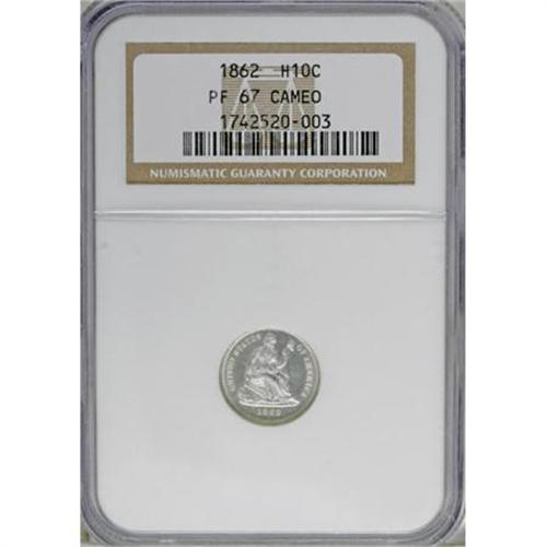 <B>1862 H10C PR67 Cameo NGC.</B></I> This splendid Superb Gem half dime is visually entrancing and technically impressive, as both sides display razor-sharp definition and intensely watery reflectivity in the fields. Trace amounts of die rust are noted on the figure of Seated Liberty, but post-strike defects are nonexistent. Census: 7 in 67 Cameo, 0 finer (12/07). <BR><BR><b>Shipping:</b> Coins & Currency (<a target="_blank" href="http://www.heritageauctions.com/common/shipping.php">view shipping information</a>)