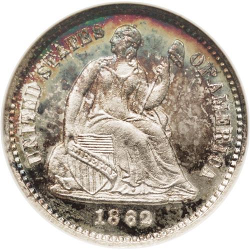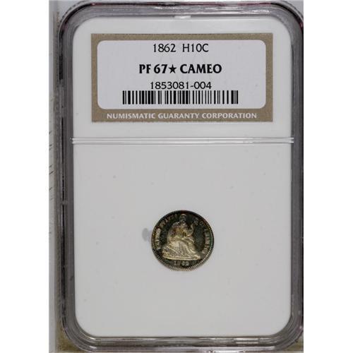 <B>1862 H10C PR67 <img border='0' src='http://www.heritagecoins.com/images/star.gif' width=10 height=10> Cameo NGC.</B></I> Splashes of honey-gold, ocean-blue, ruby, and aqua patina endow this razor-sharp Civil War Superb Gem. Icy devices demonstrate exemplary contrast with the flashy fields. Just 550 proofs were struck. Technically the finest certified proof 1862 half dime, since none are certified as Deep or Ultra Cameo, none are certified above PR67 with or without a cameo designation, and among the ten PR67 Cameo pieces (NGC and PCGS combined), only the present specimen has received a Star designation from NGC (10/06).<BR><BR><b>Shipping:</b> Coin/Currency (<a target="_blank" href="http://www.heritageauctions.com/common/shipping.php">view shipping information</a>)