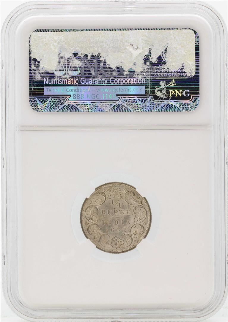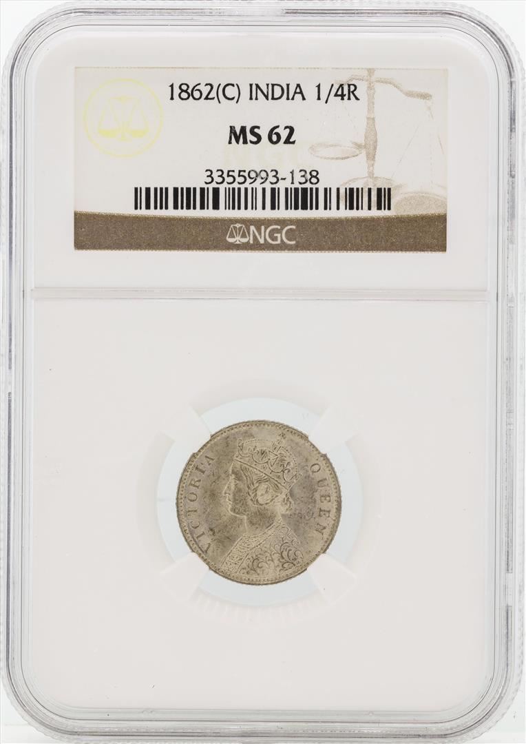 One 1862 India 1/4 Rupee Silver Coin NGC MS62. NGC Certified.