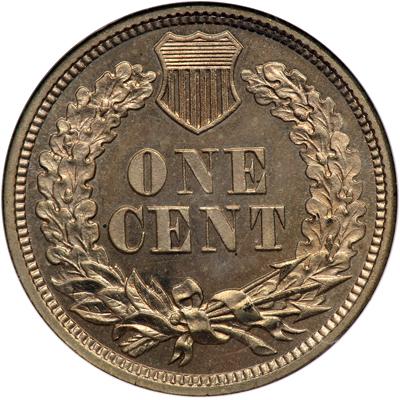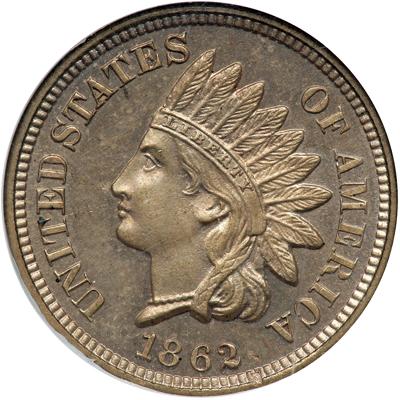 1862 Indian 1¢. NGC graded Proof 63. Housed in a Old Holder. Nicely toned over reflective surfaces. The devices are sharp throughout. Pop 23. Only 550 Proofs struck.