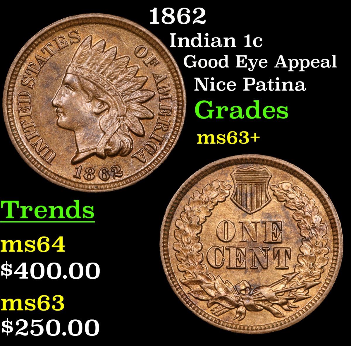 1862 Good Eye Appeal Nice Patina Indian Cent 1c Grades Select+ Unc.