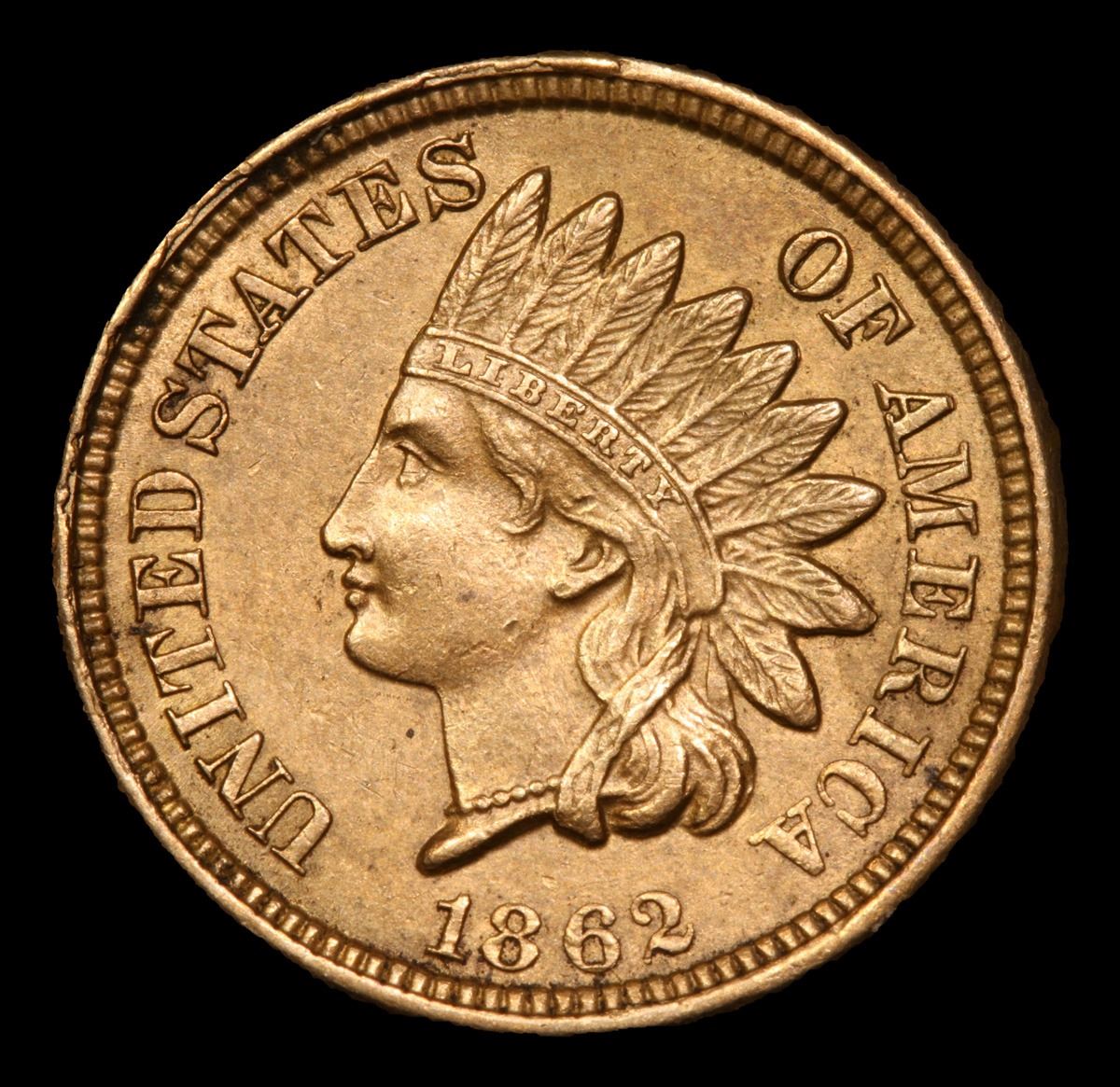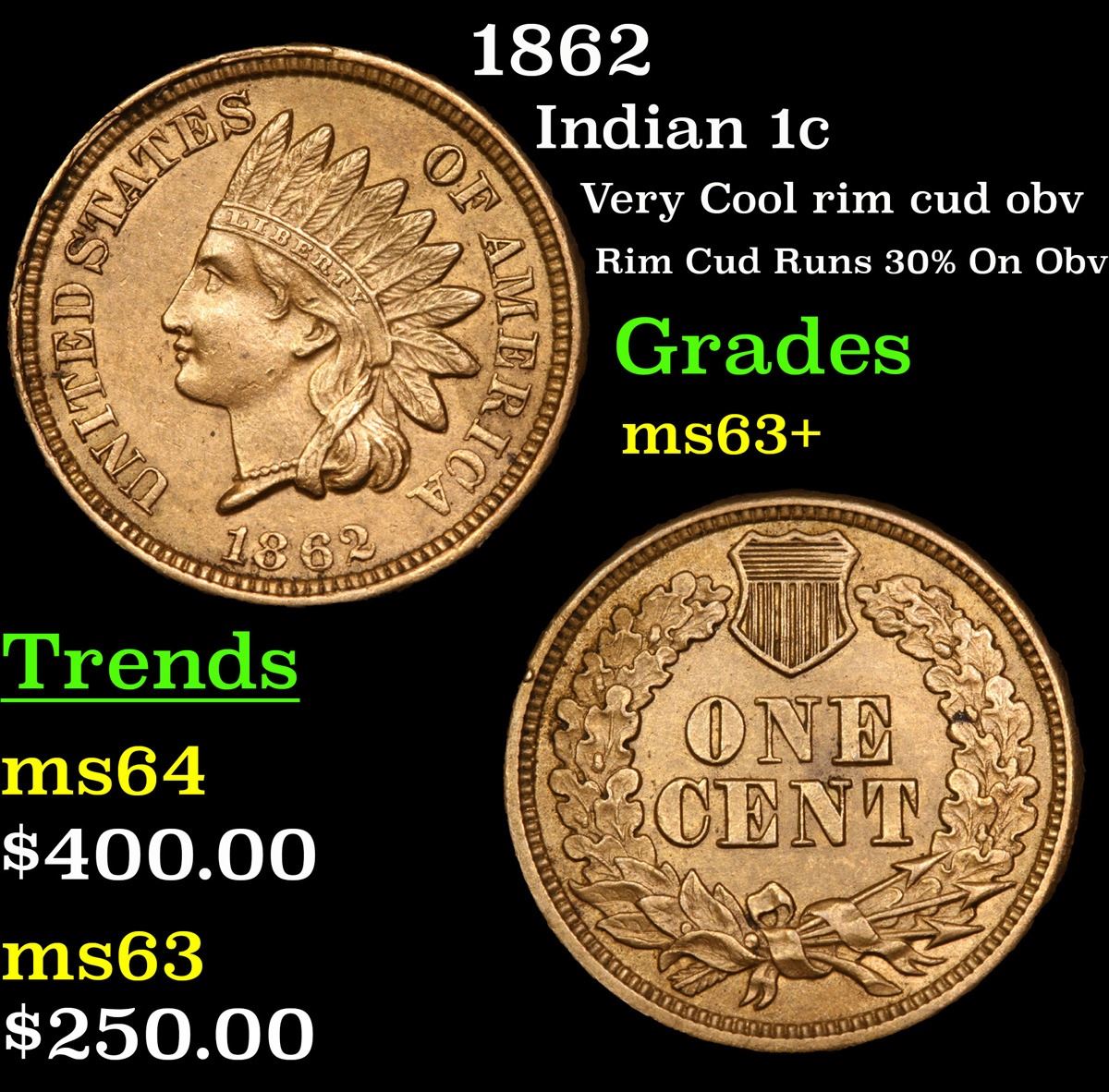 1862 Very Cool rim cud obv Rim Cud Runs 30% On Obv Indian Cent 1c Grades Select+ Unc.