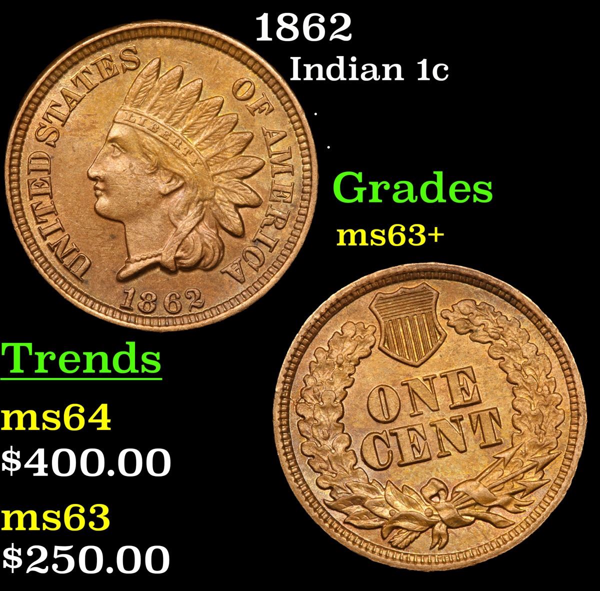 1862 Indian Cent 1c Grades Select+ Unc.