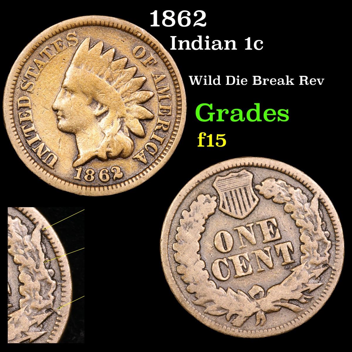 1862 Wild Die Break Rev . Indian Cent 1c Grades f+.