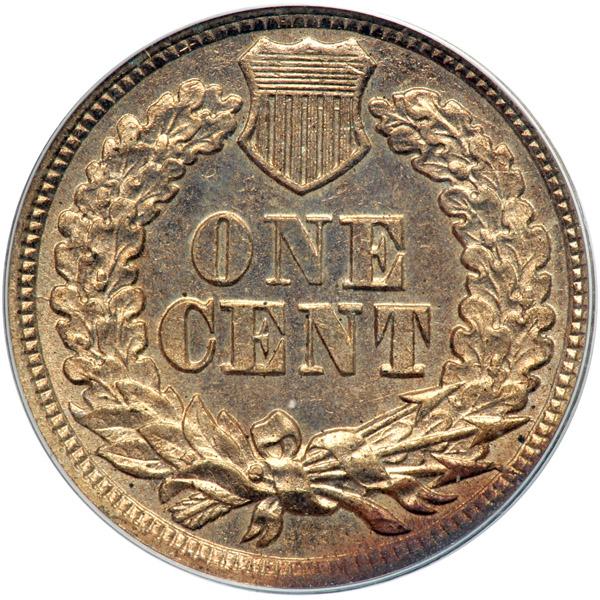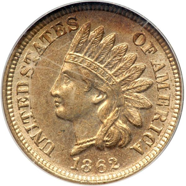 1862 Indian Head Cent. PCGS graded MS-63. Housed in an Old Green Holder. Some areas are deeply toned (PCGS # 2064) .