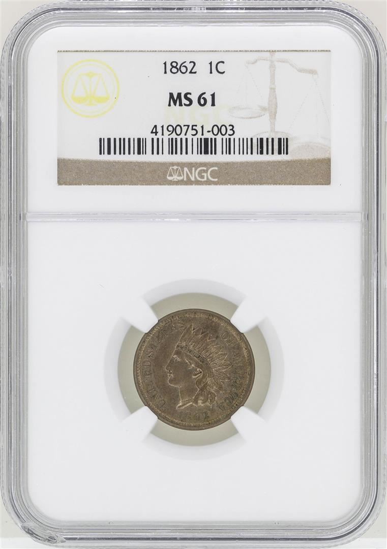 One 1862 Indian Head Cent Coin NGC MS61. NGC Certified.