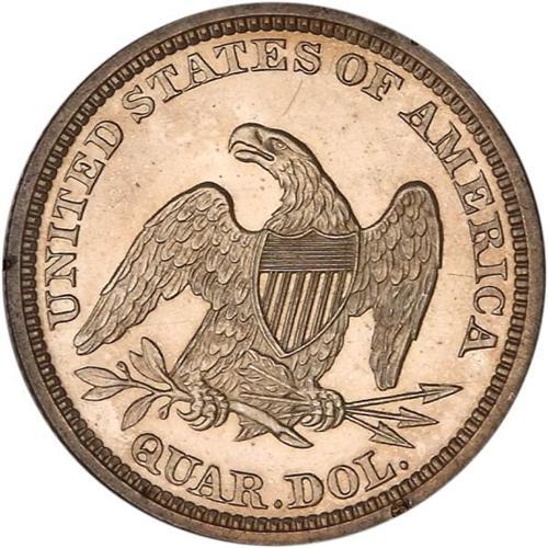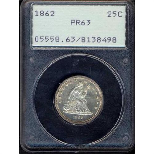 <b>1862 Liberty Seated Quarter Dollar. PCGS graded Proof 63.</b> A delicately toned and extremely choice 1862 quarter that has reflective fields and gently frosted devices. Struck with preciseness only now and then found. Proof mintage was only 550 pieces <b>(PCGS # 5558)</b> <i>
