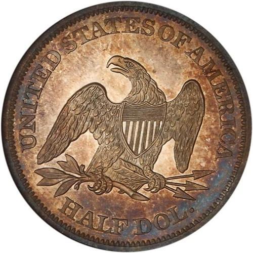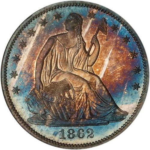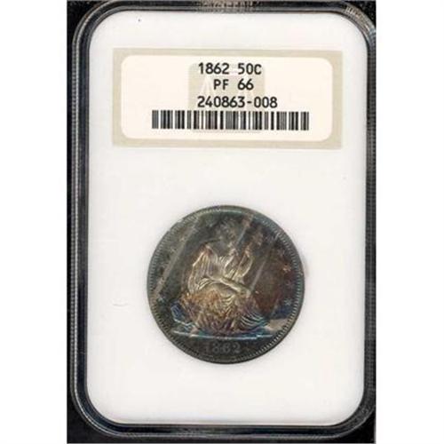 <b>1862 Liberty Seated Half Dollar. NGC graded Proof 66.</b> The surfaces are judged by us to be beautifully toned in color with ample steel blue iridescence, and quite lustrous, quite "flashy." The grade acting on behalf of its outstanding originality, improves the appearance all the more. Judging by the photographs, no one can deny that this piece was fully struck in all the key places with pinpoint detailing on the stars, Liberty, both shields, and all of the eagle's feathers including those on the legs. A marvelous appearing Gem. Proof mintage was only 550 pieces <b>(PCGS # 6416)</b> <i>