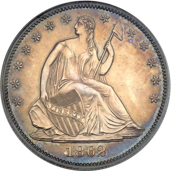 1862 Liberty Seated Half Dollar. PCGS graded Proof 62 PQ. Housed in an Old Green Holder. Nicely toned. Only 550 Proofs struck. Scarce No Motto Type (PCGS # 6416) .
