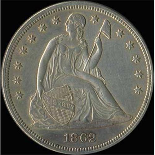 A crisply struck and well detailed 1862 seated Liberty dollar, one of a mere 12,090 pieces struck. While it has been dipped, given sufficient time and nothing else, it will retone to a nice old-silver color, as it has already begun to do around the date a