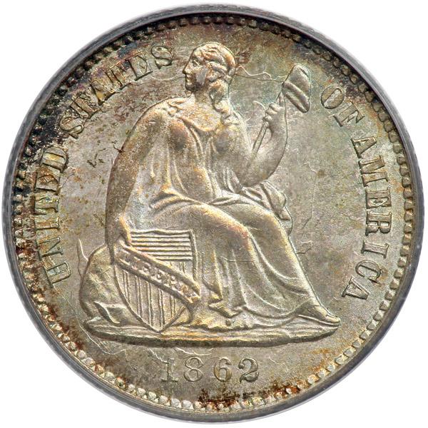 1862 Liberty Seated Half Dime. PCGS graded MS-64. Boldly struck with delicate natural toning. A choice Premium Quality exzample of the Legend Obverse Type.Pop 118; 125 finer (PCGS # 4381) .