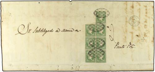 1862 NUEVITAS a PUERTO PRINCIPE. Plica Judicial circulada con un bloque irregular de siete del 1 real verde. MAGNIFICA Y MUY RARA.
