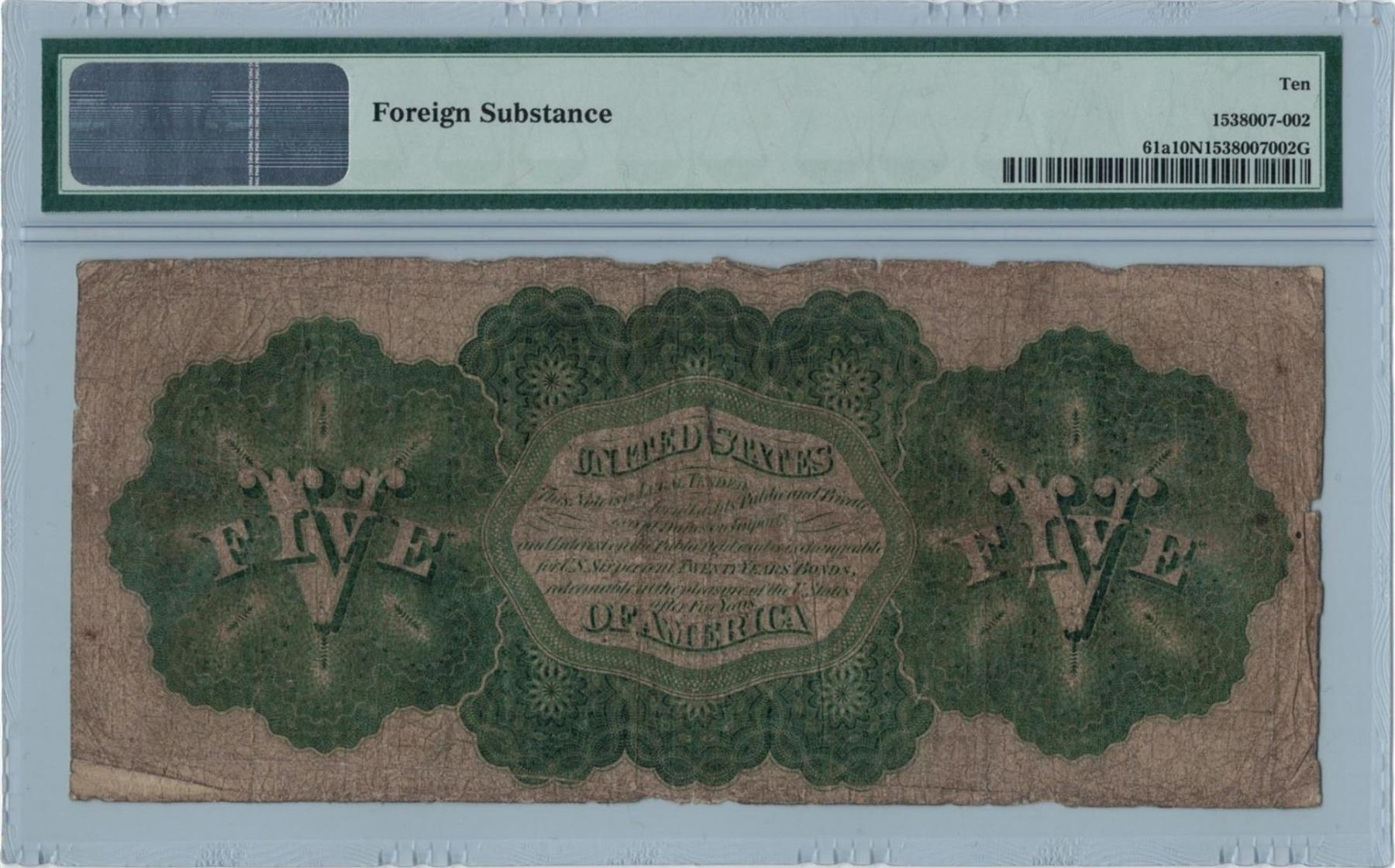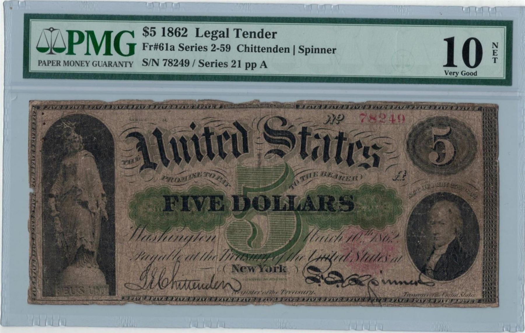 One 1862 PMG VG 10NET $5 Legal Tender Bank Note.