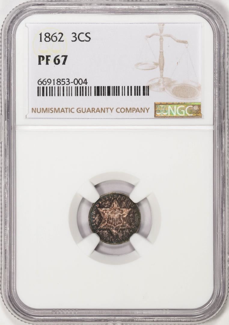 One 1862 Proof Three Cent Silver Coin NGC PF67. NGC Certified.