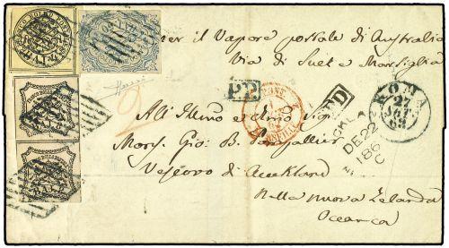 1862 ROMA a AUCKLAND (Nueva Zelanda). 4 baj. amarillo, 8 baj. rosa y 50 baj. azul. Circulada via Marsella, fechador de llegada a AUCKLAND en el anverso. Franqueo de 70 baj. equivalente a un doble porte. Extraordinariamente rara destinación, SOLO DOS CONOCIDAS a Nueva Zelanda. Cert. SORANI.