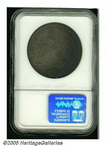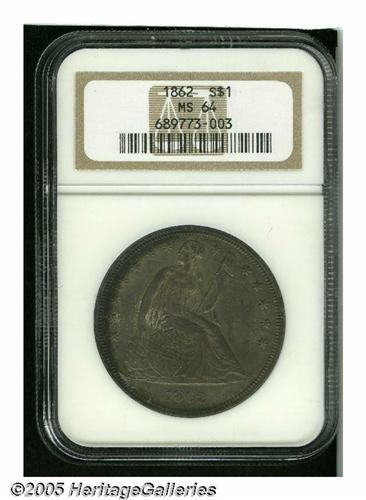 <B>1862<S$1> MS64 NGC.</B></I> Although the 1862 Dollar was minted in low numbers - just 11,540 business strikes were struck in this year, a fair number have survived to the present day. This issue becomes rare in Mint State, especially so in MS64 or better. Only 22 pieces have been so graded by NGC with just two finer (2/05). The sharply struck surfaces on this piece show deep golden and gray toning with aqua accents, and a thin arc of charcoal-gray around the left side of the obverse. When angled just so beneath a light the underlying, original luster is still apparent. A few minute marks on Liberty's midsection and left arm, and in the adjacent right obverse field, limit the grade. Population: 23 in 64, 2 finer (6/05).