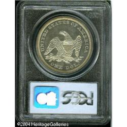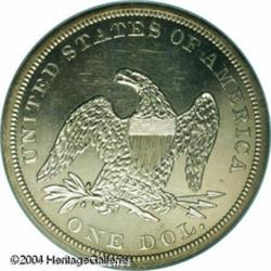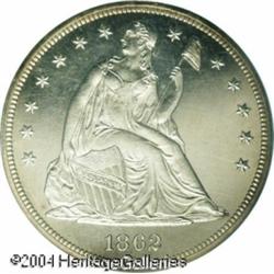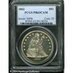 1862 S$1 PR63 Cameo PCGS. Deeply reflective with i <B>1862 S$1 PR63 Cameo PCGS.</B></I> Deeply reflective with intermittent hairlines in the fields and tinges of champagne color at the peripheral areas. One of just 550 proofs struck for collectors, and a date made even more desirable by the extreme scarcity of high grade business strikes. <BR><BR><B>Important notice:</B> Heritage usually auctions material at the rate of 200-250 lots per hour. On some occasions eBay Live bid software or the Internet may not be able to keep up with the pace of the auction. We recommend placing a realistic absentee bid now as insurance to avoid disappointment. Occasionally the auctioneer may eliminate or reject an eBay Live bid, and the auctioneer may also reopen a lot after the close of the eBay live bidding (usually because we missed an audience bid), and may reject your bid even if it shows you as the winning bidder. By bidding via eBay Live, you agree that Heritage may award the lot to another bidder at its sole discretion under the circumstances described above or any other reasonable circumstances. Since eBay bids are not shown to us until we open the lot on the floor, we treat those bids just like floor bids. In most cases the floor responds before the eBay bid is presented to us, due to Internet lag time, so for consistency we have made it a policy that floor bids are always considered first over tie eBay live bids. Also please note that all Heritage lots purchased through eBay Live carry a 20% Buyer's Premium. Please make sure you read the Terms and Conditions before you bid. This lot is being auctioned in conjunction with a live floor auction by Heritage Galleries & Auctioneers. All final auction and invoice information will be supplied by Heritage Galleries & Auctioneers, and all other information should be considered preliminary. Lot:6395