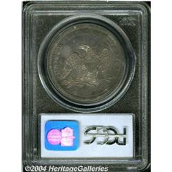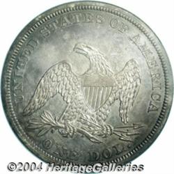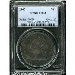 <B>1862<S$1> PR63 PCGS.</B></I> This needle-sharp Select specimen has deep peach-gold and electric-blue colors. Careful study of the fields reveals faint striations beneath the patina, but these appear to be primarily of mint origin. Both business strikes and proofs of this low mintage Civil War date are very scarce. While the 1862 Gold Dollar had huge mintages, proofs and business strikes of the Silver Dollar combined for a mere 12,090 pieces, only 550 coins among which were proofs. Population: 44 in 63, 29 finer (7/04). <BR><BR><B>Important notice:</B> Heritage usually auctions material at the rate of 200-250 lots per hour. On some occasions eBay Live bid software or the Internet may not be able to keep up with the pace of the auction. We recommend placing a realistic absentee bid now as insurance to avoid disappointment. Occasionally the auctioneer may eliminate or reject an eBay Live bid, and the auctioneer may also reopen a lot after the close of the eBay live bidding (usually because we missed an audience bid), and may reject your bid even if it shows you as the winning bidder. By bidding via eBay Live, you agree that Heritage may award the lot to another bidder at its sole discretion under the circumstances described above or any other reasonable circumstances. Since eBay bids are not shown to us until we open the lot on the floor, we treat those bids just like floor bids. In most cases the floor responds before the eBay bid is presented to us, due to Internet lag time, so for consistency we have made it a policy that floor bids are always considered first over tie eBay live bids. Also please note that all Heritage lots purchased through eBay Live carry a 20% Buyer's Premium. Please make sure you read the Terms and Conditions before you bid. </span></font></tr></table></td></tr></table>
