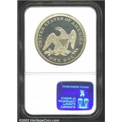 1862 S$1 PR64 Cameo NGC. A visually pleasing example of this low mintage Civil War issue. The fields are deeply mirrored and there is a significant amount of mint frost over the devices, which gives the coin a profound two-toned cameo appearance. Unlike proofs struck today, in the 1860s no thought was given by the Mint to producing a cameo proof. In fact, such a term was unknown until relatively recently. The white-on-black appearance so desired by collectors today was merely the product of the use of a new pair of dies. Only a few coins from each die pairing had such contrast, and when it faded after a few strikes no effort was given to renewing it. Population: 2 in 64, 2 finer (7/02). Important notice: We expect to be auctioning lots at the rate of 200-250 per hour. Sometimes eBay Premier live bid software cannot keep up with that pace, so we strongly recommend that you place a realistic proxy bid now as insurance to avoid disappointment. Also please note that all Heritage/CAA lots purchased through eBay Premier carry a 20% Buyer's Premium. Please make sure you read the Terms and Conditions.