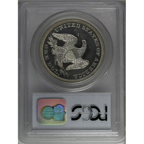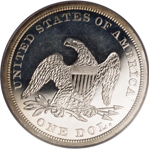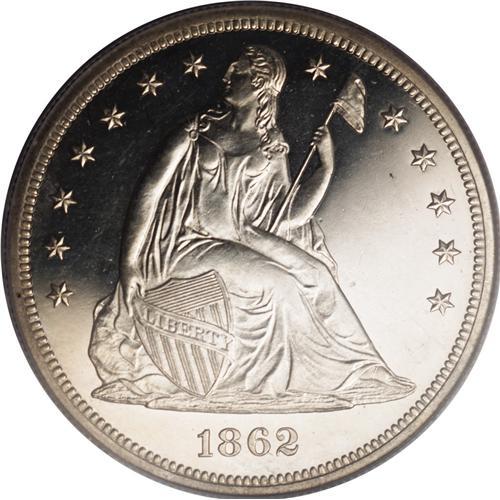 <B>1862 S$1 PR65 Cameo PCGS.</B></I> The 1862 is a popular proof date for several reasons. It was struck during the Civil War. The associated business strike production was only 11,540 pieces. Proofs were limited to 550 pieces, some of which were likely melted as unsold. Few proofs have survived in Gem condition. In fact, the present piece is tied with one other as the finest certified by PCGS(9/06). For pedigree purposes, we mention a small planchet flaw in the field near the lower right drapery. Delicate gold toning near the borders denies full brilliance. Impressive cameo frost is uniform throughout the devices and legends. The strike is good, although there is a hint of softness on the peak of the left (facing) wing and on Liberty's knees. Many advanced numismatists have undertaken the challenge of assembling a set of proof Seated dollars, and the No Motto issues are invariably scarcer than their Motto counterparts.<BR><I>From The Dr. Robert J. Loewinger Collection.</B></I><BR><BR><b>Shipping:</b> Coin/Currency (<a target="_blank" href="http://www.heritageauctions.com/common/shipping.php">view shipping information</a>) <BR><BR><B>Important noti