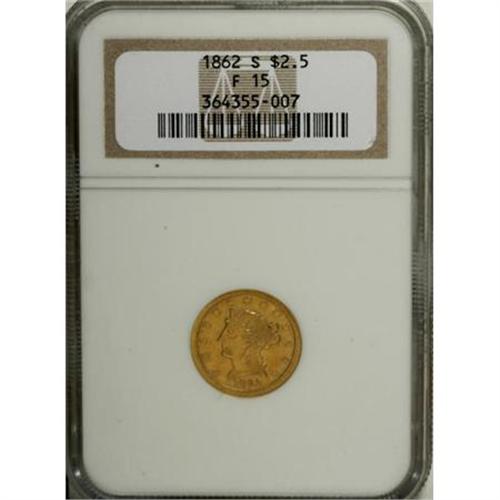 <B>1862-S $2 1/2 Fine 15 NGC.</B></I> This softly struck and lightly abraded quarter eagle retains hints of mint luster in the protected areas. A scant 8,000 pieces were issued, and no contemporary thought was given to saving examples for posterity.<BR><BR><B>Coin Engraver:</B> Christian Gobrecht<BR><BR><b>Shipping:</b> Coins & Currency (<a target="_blank" href="http://www.heritageauctions.com/common/shipping.php">view shipping information</a>)