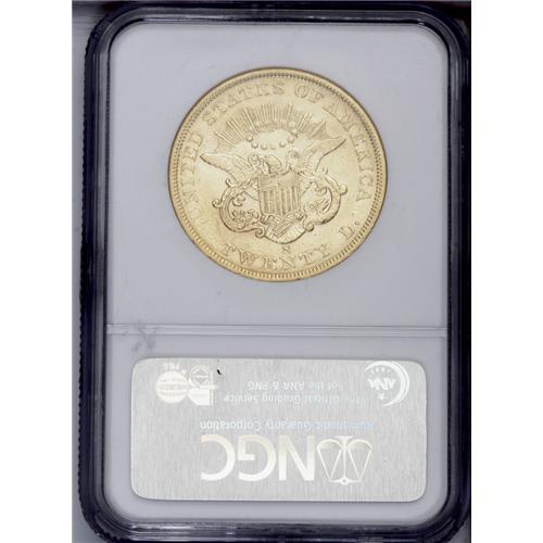 <B>1862-S<$20> AU53 NGC.</B></I> A still-lustrous and lightly marked yellow-gold example of this Civil War issue. Minor, even wear blends with this coin's typical soft strike.