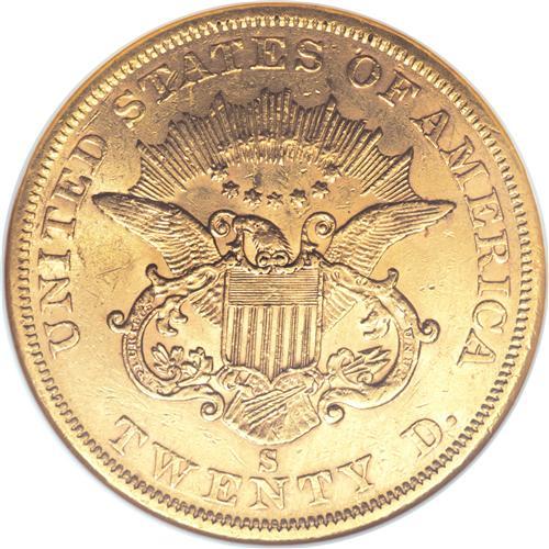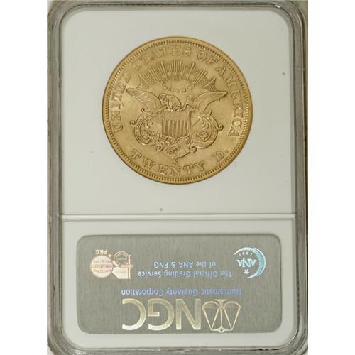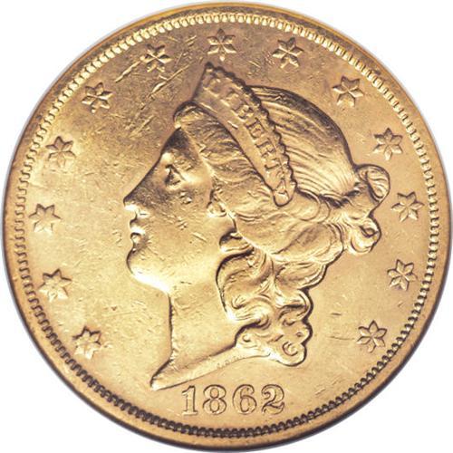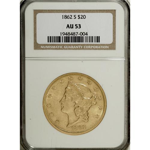 <B>1862-S $20 AU53 NGC.</B></I> Highly lustrous surfaces with pale yellow color provide excellent eye appeal for this attractive piece. Recent treasure recoveries have dramatically increased the number of pieces known, and yet this date remains a difficult one for collectors of higher grade double eagles.<BR><BR><b>Shipping:</b> Coins & Currency (<a target="_blank" href="http://www.heritageauctions.com/common/shipping.php">view shipping information</a>)