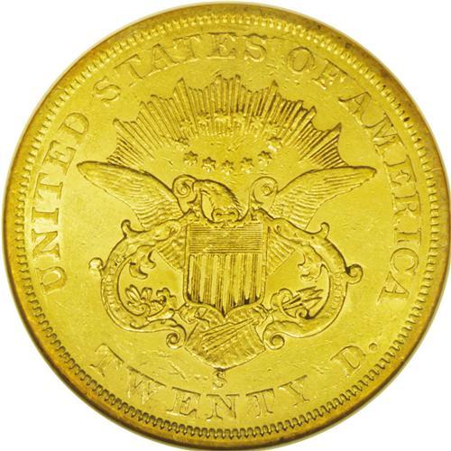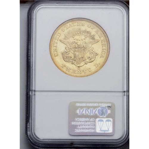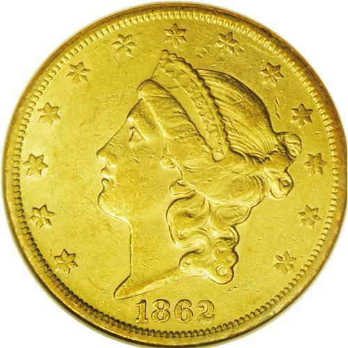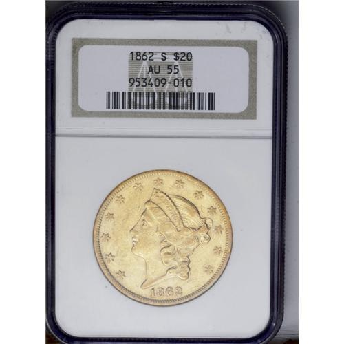 <B>1862-S<$20> AU55 NGC.</B></I> Lightly worn with numerous bagmarks and a bright, partially lustrous appearance. Rich golden patina gently mixes with pink-gold over each side. This popular Civil War issue becomes increasingly scarce in higher grades, and is quite rare in Mint State.